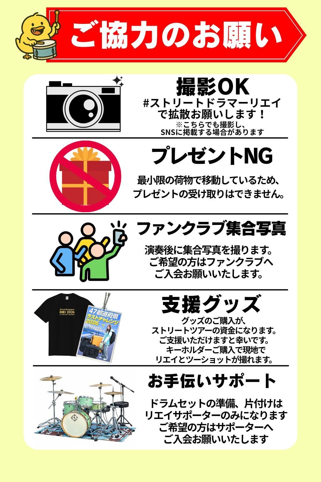 山口限定!数量1つ限り! 世界にひとつだけの“ONLY ONE”スペシャルセット! リエイ47ツアー山口を記念した、超プレミアムな《限定1セット》が登場! ストリートドラマーリエイと一緒に山口の思い出をカタチにしませんか?✨ 《セット内容》 ① ご当地Tシャツ(リエイとお揃いデザイン!) 山口限定アートが入った特別仕様 ② あなたのお名前入りステッカー(バスドラム掲載) バスドラムに“あなたのお名前”を掲載!ストリート場所順に番号がつきます✨ ★バスドラム掲載期間について★ 5/14山口ストリート日からツアーファイナル(今年中を予定)までとなります ③ ご当地キーホルダー(山口ver.) ここでしか手に入らない限定デザイン! ④ あなたのお名前入りステッカー 記念に残るオリジナルステッカー♪ ⑤ あなただけのご当地ドラム動画 山口での演奏動画を、あなただけにお届け!一生の思い出になる特別映像です! ここがスペシャル! ✔ 限定1セットのみの販売 ✔ お名前入りで世界に一つ ✔ 山口限定デザイン ✔ 動画付きの超プレミアム体験 リエイ47ツアー《山口》の特別な瞬間を、 あなたの名前とともに刻みます。 ✨早い者勝ちのONLY ONE✨ このチャンスをお見逃しなく! ①②④⑤の情報をメール又は備考欄へご記入ください。 ①ご当地限定Tシャツ(リエイとお揃い) →・サイズ ・色(白or黒)をお選びください ②あなたのお名前入りステッカー(バスドラムに掲載) →・名前の背景色・掲載したいお名前をお送りください ④あなたのお名前入りステッカー →・掲載したいお名前をお送りください ⑤あなただけのご当地ドラム動画 →・動画内でお名前をお呼びいたしますので、 ご希望のお名前をお送りください